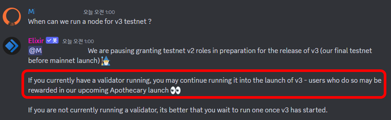 엘릭서 텔레그램을 확인해보면, 테스트넷 v1 및 v2 참여유저에 대해서는 보상이 지급될 것이라고 언급한 바 있습니다. 이를 미루어 보았을 때, 우리가 참여할 테스트넷 v3에서도 참여유저들에게 적절한 보상이 지급될 것이라고 예상할 수 있습니다.