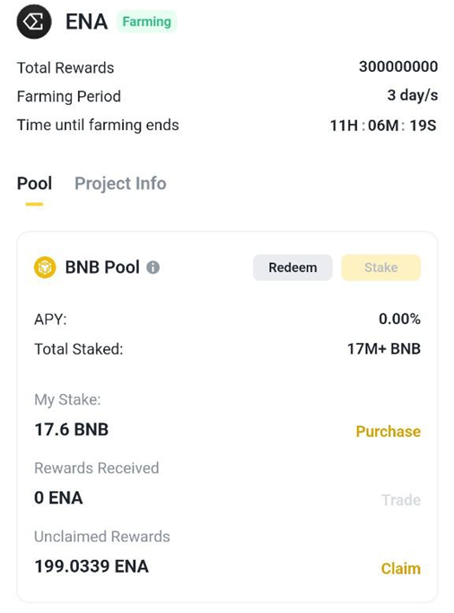 안녕하세요, 랜과장입니다. 이전 포스팅에서 소개해드렸던 바이낸스 ENA 런치풀에 참여하고 계신가요? 저는 17.6 BNB 토큰을 이용하여 바이낸스 ENA 런치풀에 참여하고 있고, 현재까지 약 199개의 ENA 토큰을 에어드랍 받았습니다. 앞으로 11시간정도 채굴시간이 남았는데, 약 50개 정도 더 토큰을 에어드랍 받을 것이라고 예상합니다.